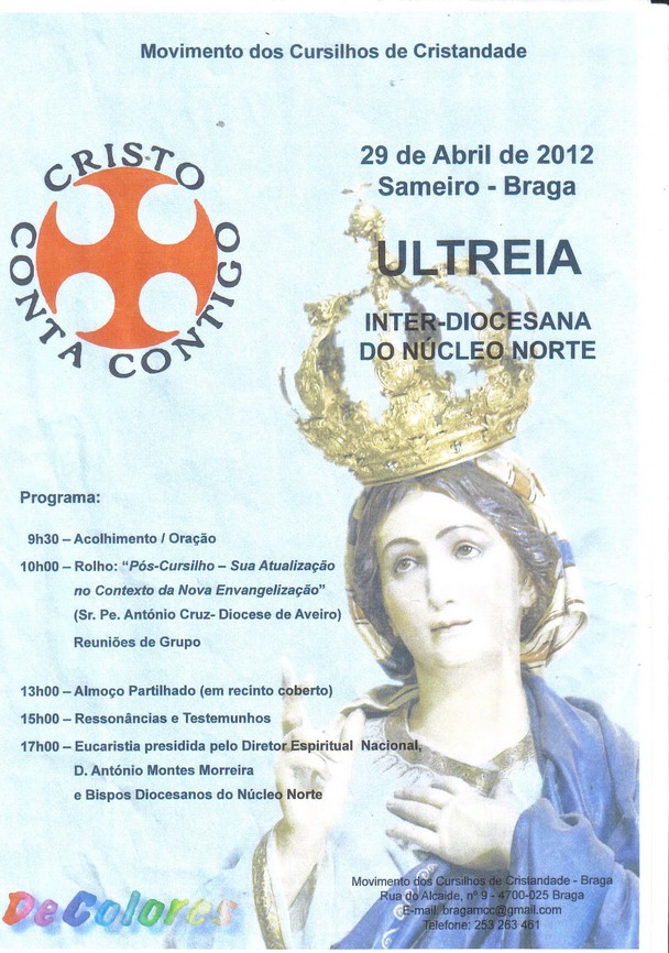Será no próximo dia 29 de Abril em Braga, no Sameiro. Insere-se nos 50 anos de Crusilhos em Braga, estarão pessoas de várias Dioceses do Norte do país. Se quiser ir de autocarro, segundo informações do Secretariado, o autocarro partirá da Meadela às 8h da manhã e à volta de 20 minutos antes de Ponte de Lima. Passa também pela rotunda de Mazarefes. No regresso, a saída de Braga será às 18h30m. O preço da viagem é de 6 euros. Leve farnel para o almoço que será em recinto coberto. A Eucaristia é às 17 horas. Para marcar lugar no autocarro contacte o Borlido. Segue-se o programa.